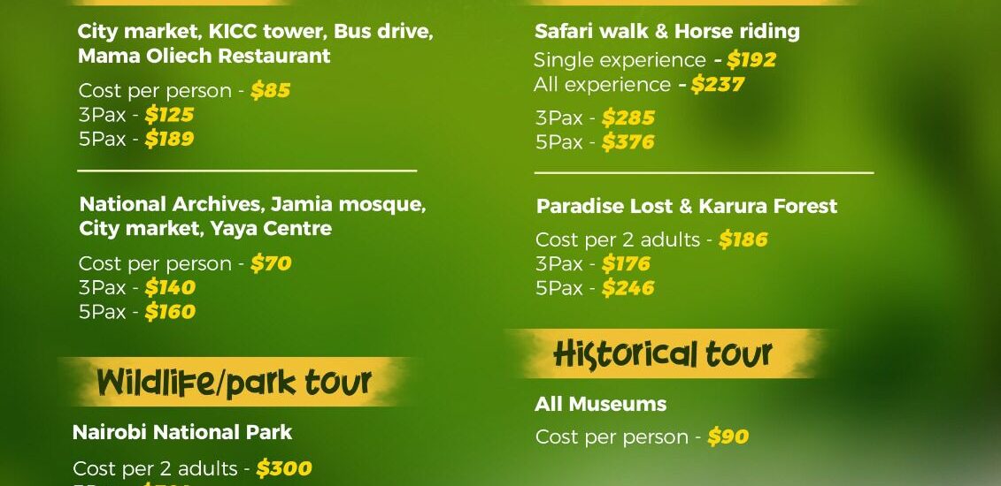 DAY TOUR PACKAGES City Tour City Market | KICC Tower | Bus Drive | Mama Oliech Restaurant Cost per person: $85 3Pax: $125 5Pax: $189 National Archives | J...